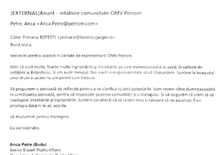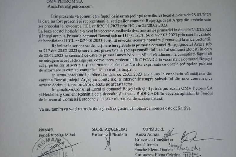 "Prin prezenta vă comunicăm faptul că în urma decizie consiliului local din 28 martie s-a procedat la revocarea HCL nr..... si HCL nr...(...) În urma consultării publice din 25 martie am ajuns la concluzia că locuitorii din Boțești nu doresc nicio intervenție asupra subsolului din raza comunei" a fost răspunsul transmis, marți, 28 martie, de către C.L. Boțești.