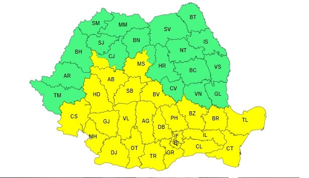 ”În Oltenia, Muntenia, Dobrogea, cea mai mare parte a Transilvaniei şi sudul Banatului vor fi perioade cu instabilitate atmosferică accentuată. Aceasta se va manifesta prin averse torenţiale, frecvente descărcări electrice, intensificări ale vântului (viteze de 50...70 km/h), vijelii şi căderi de grindină. În intervale scurte de timp sau prin acumulare cantităţile de apă vor fi de 20...30 l/mp şi izolat de peste 50 l/mp”, a transmis ANM.