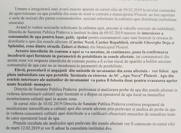 DSP Prahova a avertizat, prin intermediul unei scrisori transmise Inspectoratului Şcolar Prahova, că apa din unităţile de învăţământ aflate pe raza avariei Apa Nova nu este potabilă.Reprezentanţii DSP recomandă atât elevilor cât şi cadrelor didactice şi personalului auxiliar consumul apei îmbuteliate şi a apei furnizate din surse alternative de către Apa Nova în cursul zilei de luni.Vă reamintim că o avarie majoră la reţeaua de apă potabilă din zonele cartier Nord, cartier Republicii, străzile Gheorghe Doja şi Splaiului, zona dintre străzile Zidari şi Deltei) afectează mii de ploieşteni, încă de sâmbătă dimineaţă