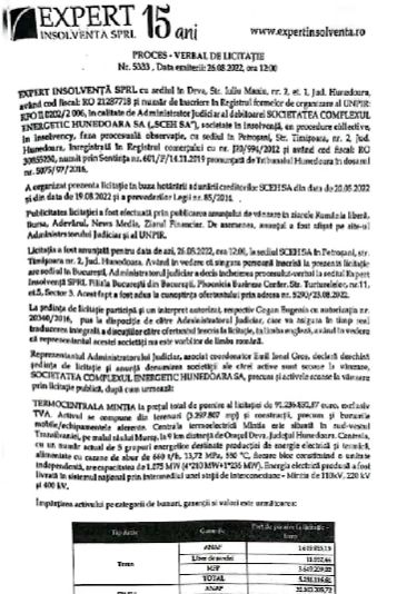 Procesul verbal de licitație pentru Termocentrala Mintia a fost prezentat și dezbătut, cu lux de amănunte