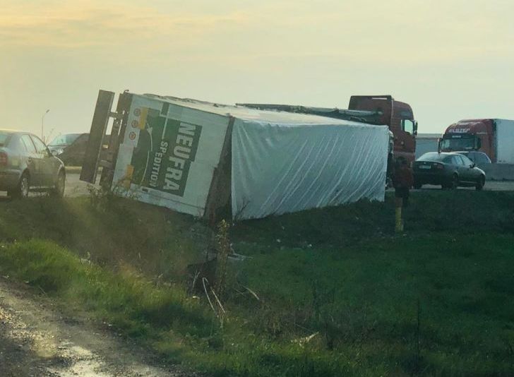 FOTO TIR răsturnat pe DN1, în giratoriul de la Strejnicu