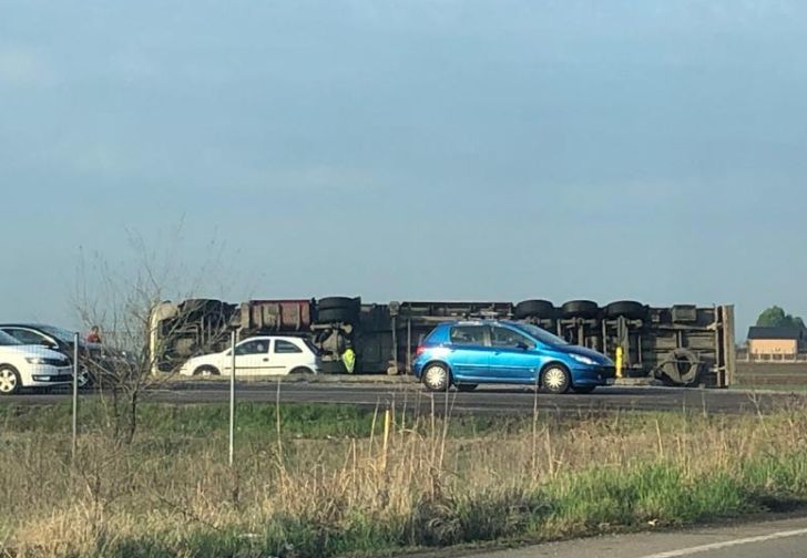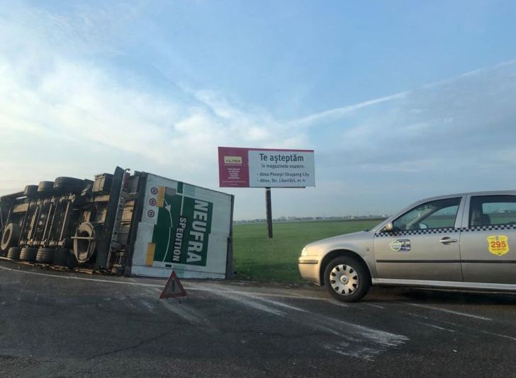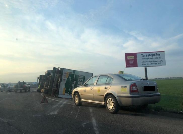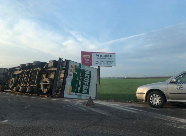 Un TIR încărcat cu cherestea s-a răsturnat, în noaptea de marți spre miercuri, în jurul orei 00.30, pe DN 1 - Centura e Vest a Ploieștiului, în zona giratoriului de la Strejnicu.