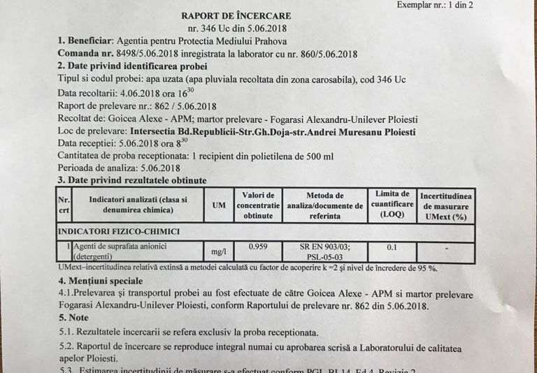 În cadrul întâlnirilor de lucru ale viceprim-ministru Grațiela Gavrilescu, ministrul mediului, în județul Prahova, reprezentanții mass-media au semnalat apariția, în Ploiești, pe străzile din apropierea Unilever, a unor ape pluviale cu aspect de saponificare.Ministrul Grațiela Gavrilescu a dispus comisarilor Gărzii Naționale de Mediu prezenți să preleveze de îndată probe de apă și să verifice aspectele semnalate.Probele au fost prelevate în recipiente sterile și au fost transmise, prin intermediul APM Prahova, către Laboratorul de Calitatea Apelor Ploiești, din cadrul Administrației Bazinale de Apă Buzău-ialomița, laborator acreditat RENAR.În urma analizelor, s-a constatat prezența agenților de suprafață anionici (detergenți) în cantitate de 0,1 mg/l. Precizăm că valoarea maximă admisă de lege este de 20 mg/l.