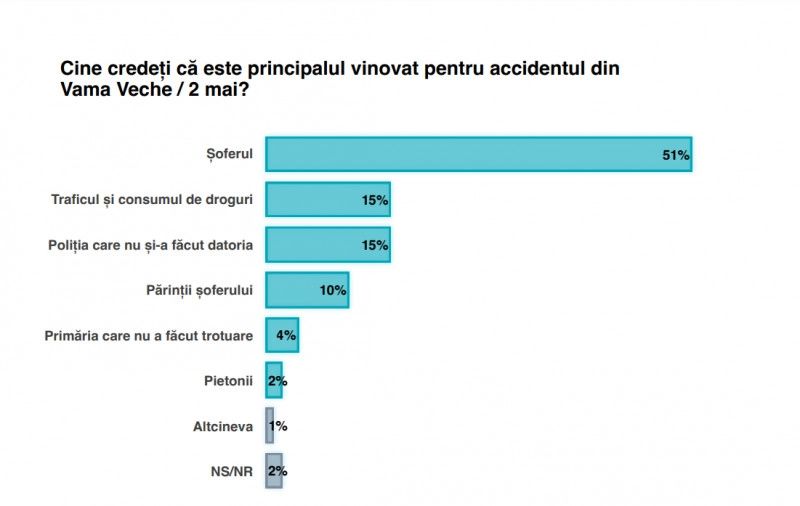 În ceea ce privește accidentul mortal din 2 Mai, 51% dintre cei chestionați cred că vina pentru accidentul mortal din 2 Mai o poartă Vlad Pascu, șoferul drogat, aflat acum în arest preventiv.