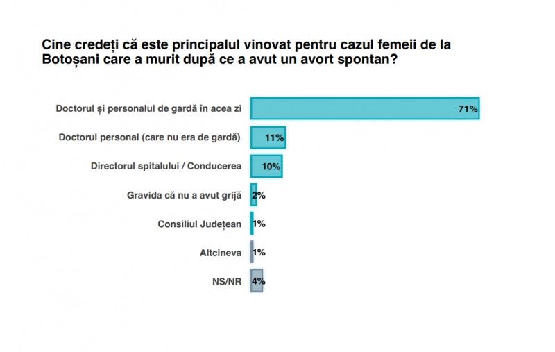 În ceea ce privește tragedia de la Botoșani, cei mai mulți participanți la sondaj, mai exact 71%, cred că de vină sunt medicul și personalul care erau atunci de gardă. 11% cred că responsabil este medicul curant al tinerei, care nu a venit să o opereze în acea noapte.