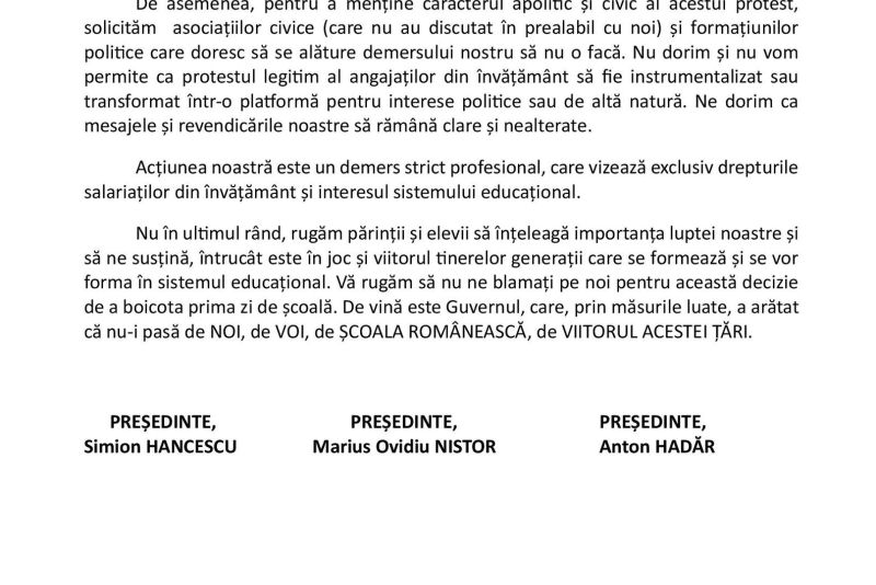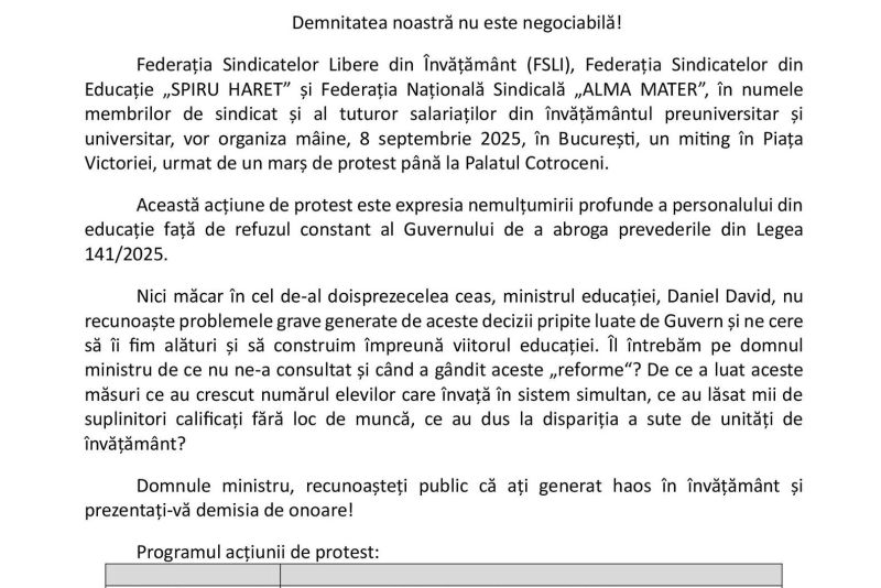 "Demnitatea noastră nu este negociabilă!Federația Sindicatelor Libere din Învățământ (FSLI), Federația Sindicatelor din Educație „SPIRU HARET” și Federația Națională Sindicală „ALMA MATER”, în numele membrilor de sindicat și al tuturor salariaților din învățământul preuniversitar și universitar, vor organiza mâine, 8 septembrie 2025, în București, un miting în Piața Victoriei, urmat de un marș de protest până la Palatul Cotroceni.Această acțiune de protest este expresia nemulțumirii profunde a personalului din educație față de refuzul constant al Guvernului de a abroga prevederile din Legea 141/2025", au transmis duminică sindicaliștii de la FLSI România.