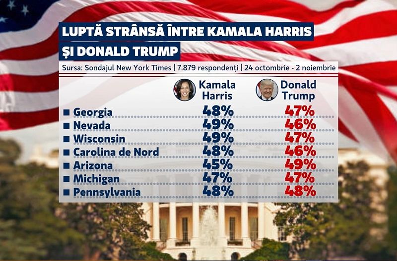 Potrivit sondajelor, în Arizona, Georgia și Carolina de Nord, prima poziție a trecut de la un candidat la altul, însă acum, Trump are parte de un mic avantaj. În Nevada, situația este în favoarea Kamalei Harris. Michigan, Pennsylvania și Wisconsin au fost conduse de Harris la începutul lunii august, dar sondajele s-au schimbat, iar republicanul are acum un avans foarte mic.