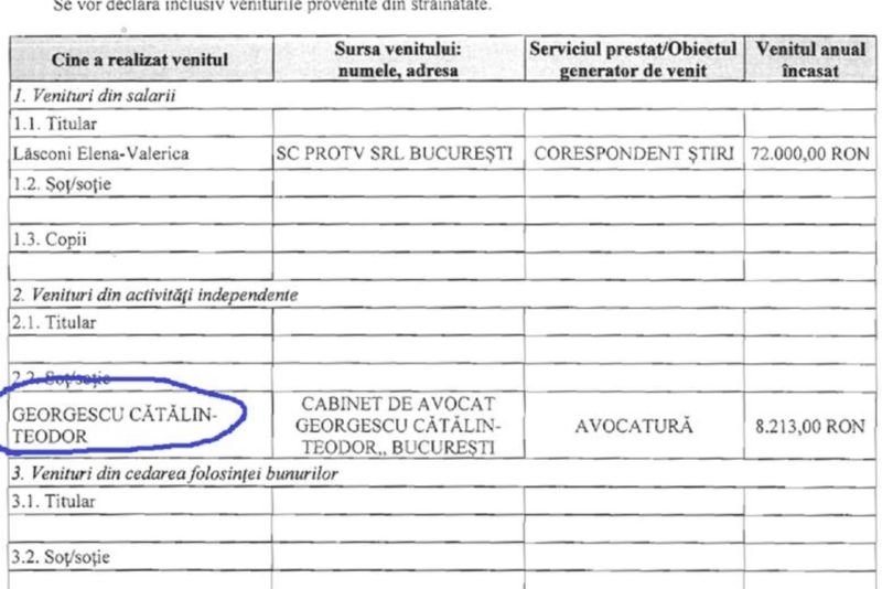 Potrivit declarației de avere depusă de Elena Lasconi, Georgescu a câștigat, în 2019, suma de 700 de lei pe lună ca avocat. Facsimil din declarația de avere din 2020 pe anul 2019 a doamnei Lasconi.